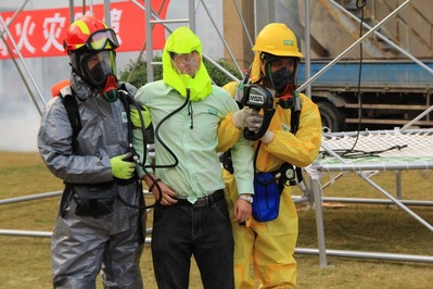 整场演习的大部分环节由梅思安(MSA)安全培训中心承办,梅思安(MSA) 安全培训中心经理孙健先生担任此次演练的总策划及现场解说员。整个演练共分四个部分,首先开始的是“密闭空间应急救援”配备了正压式长管供气呼吸器的队员 在其他队友的协助下,通过营救单元的滑轮绳索,快速下降到罐底,为被救者套上正压式紧急呼吸器的头罩施救,并利用营救单元的滑轮绳索施救。 接下来“救援技术展示及高空救援演练”详细展示了表演了高空救援的救援技术。第三科目为化学气体泄漏逃生及应急救援演练。救援队员利用了先进的热成像仪进 行搜索发现了中毒者倒地的地点,利用所带正压式呼吸器他救功能救出被救者。队员利用 MSA BD2100 一分钟快充功能,可以立刻相互充气,确保任务完成。而最后一部分上海石化消防支队开展了精彩的消防演习。