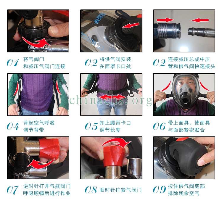 1. 佩戴时,先将快速接、断开(以防在佩戴时损坏全面罩),然后将背托在人体背部(空气瓶开关在下方),根据身材调节好肩带、腰带并系紧,以合身、牢靠、舒适为宜。